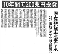 自民党の国土強靭化総合調査会(二階俊博会長)は23日、災害に強い社会資本整備を加速させるための「国土強靭化基本法案」を了承した。10年間で総額200兆円の投資を盛り込んだ国土強靭化基本計画を国が作成し、社会資本整備重点計画の上位に位置付けた上で、総合的・計画的にインフラ整備を進めていく仕組みを構築する。広域圏単位や都道府県単位、市区町村単位の計画策定も求める考え。議員立法として今国会への提出を見込んでいる。