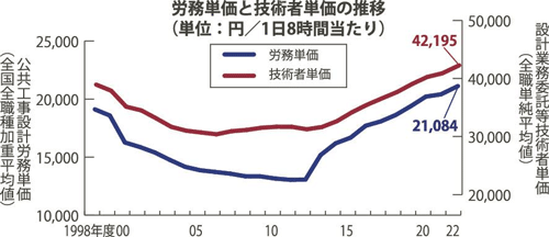 国交省は単価設定に当たって、24年4月から建設業に適用される時間外労働の罰則付き上限規制への対応を考慮。施工効率化などを踏まえた時間外労働の短縮に必要な費用を新たに反映させた。有給休暇取得の義務化分(年5日)に相当する費用も引き続き盛り込んでいる。
