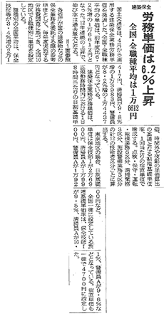 職種別の全国平均は、保全技師等が3.4%増の2万1417円、清掃員が9.8%増の1万3983円、警備員が8.2%増の1方4437円となっている。